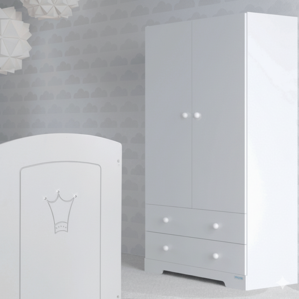 Organisieren Sie das Zimmer stilvoll mit dem Schrank aus weiß lackiertem MDF und melaminbeschichtet. 1 geräumiges Regal + integrierte Garderobe, 2 Türen mit Soft-Close und 2 Schubladen für eine optimale Aufbewahrung der Kleidung und Accessoires Ihres Kindes.