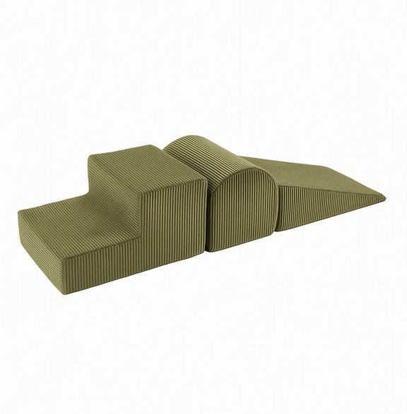 Dieser Corduroy-Parcours fügt sich in alle Räume ein und kann mit einem Bällebad, einem Pikler-Dreieck oder einem Wippmodul kombiniert werden, um die Aktivitäten zu bereichern und die Erkundungen sicherer zu machen.