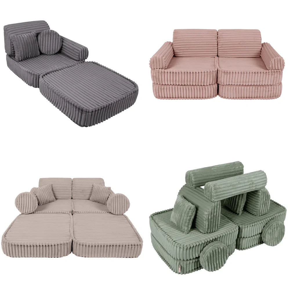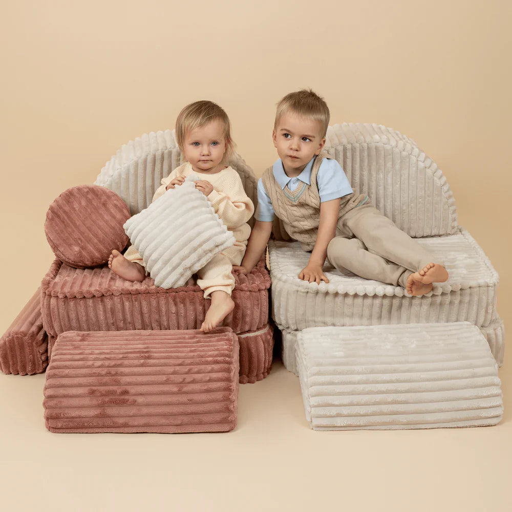Develop motor skills with the modular Loke+ sofa in Corduroy Churros. Its 10 modules in very wide rib velvet create extended courses in a perfect intermediate size to grow with your child.