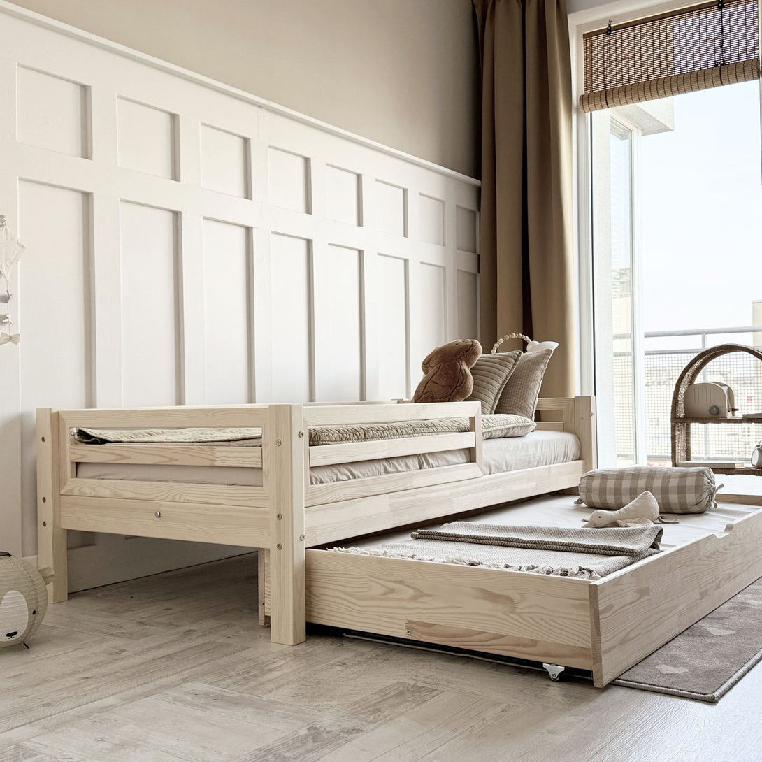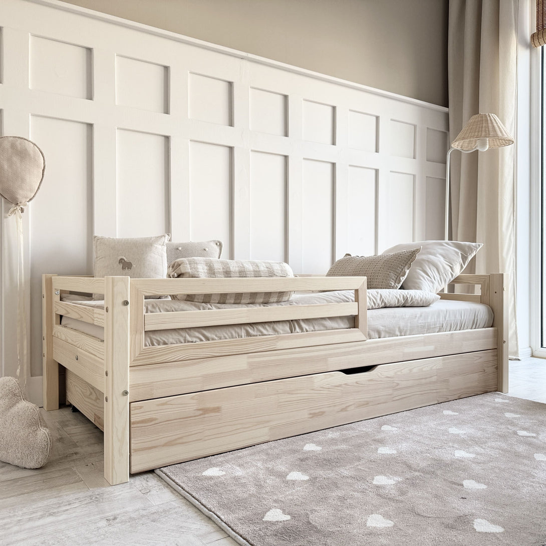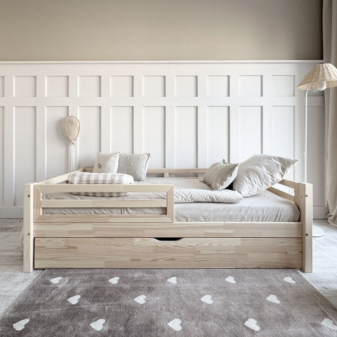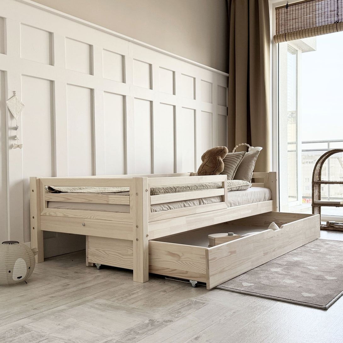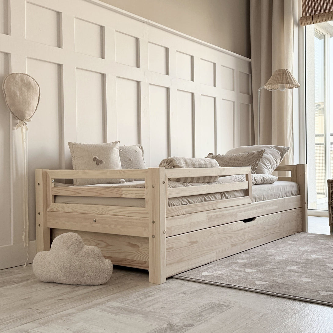 With its straight rails and large built-in drawer, this bed combines Scandinavian aesthetics, practicality, and safety. Perfect for promoting independence while saving space in your child's room.