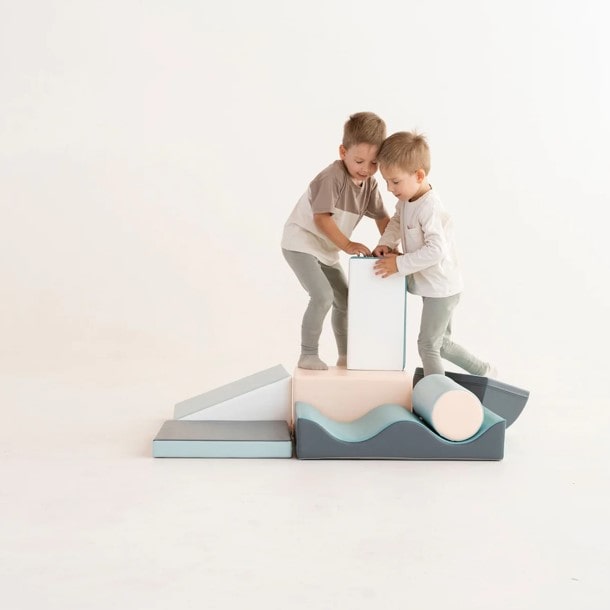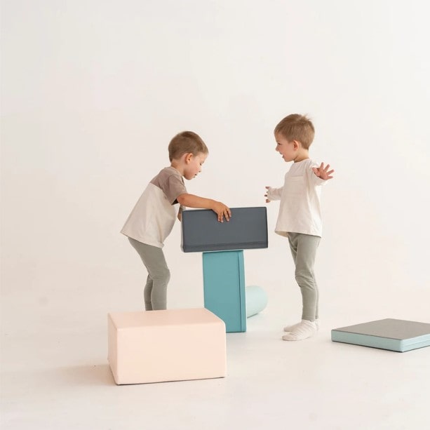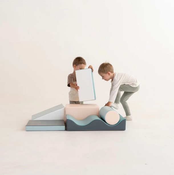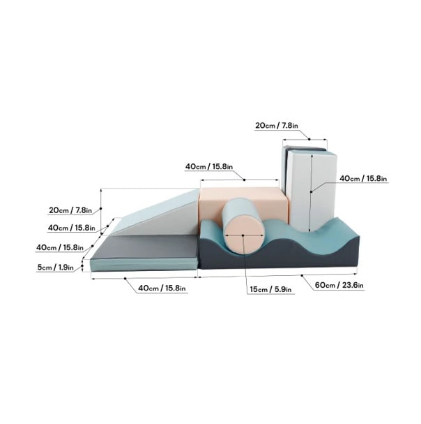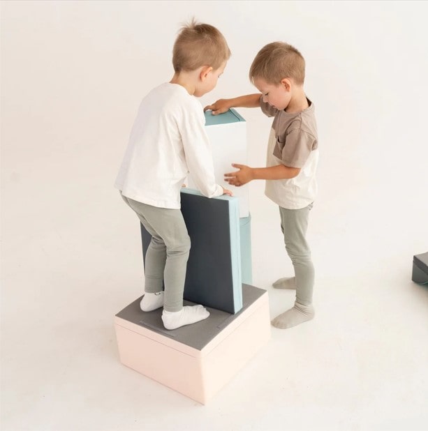 High-quality 100% recyclable foam construction covered with durable faux leather. Supports up to 100kg for family use, CE certified safety without harmful substances. Each module encourages problem-solving and spatial awareness.