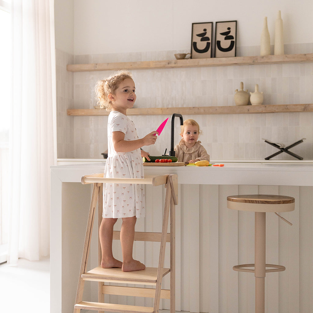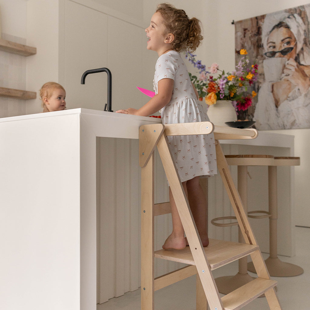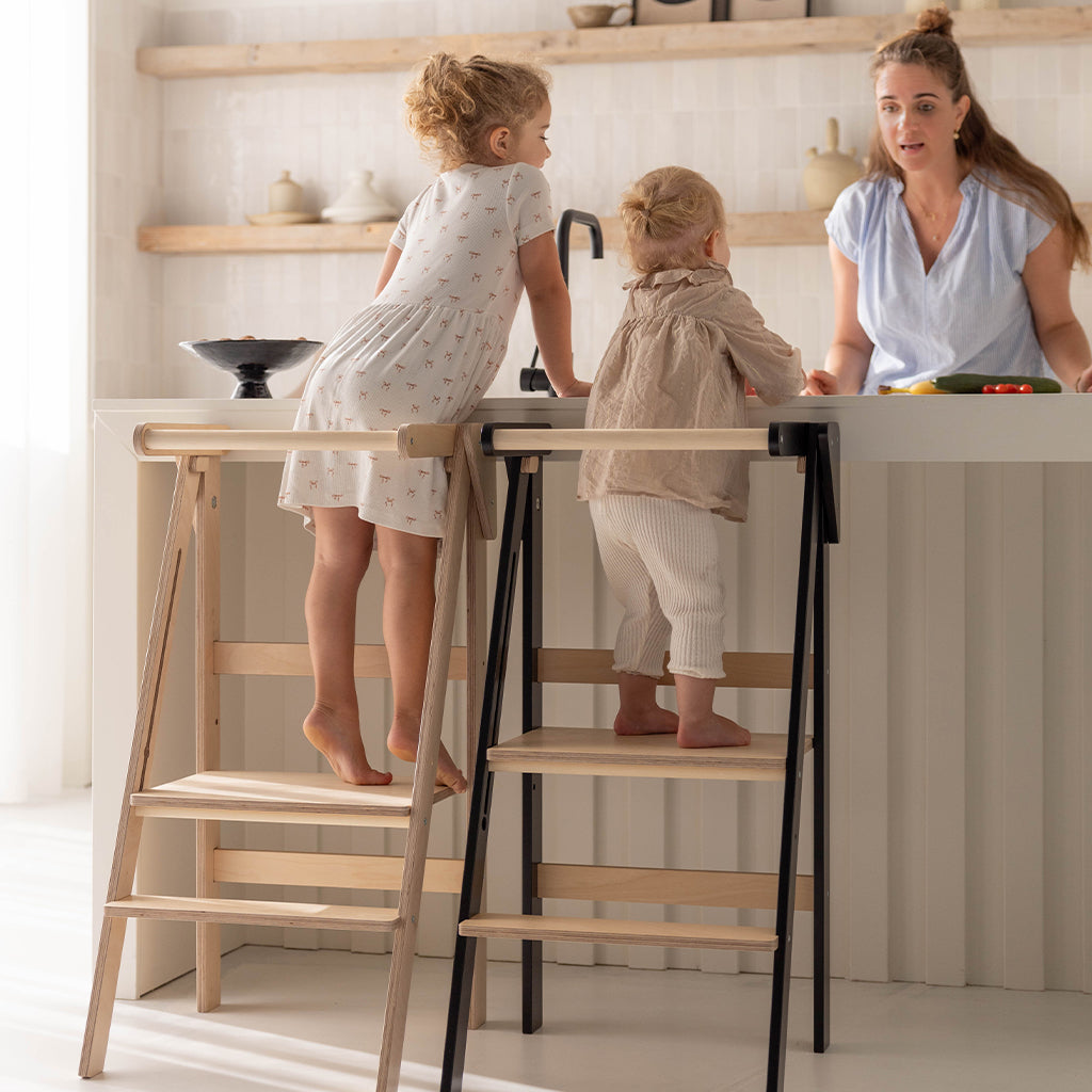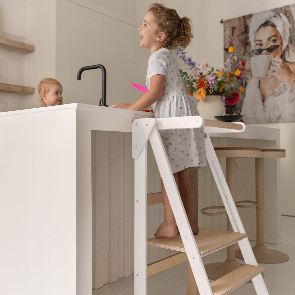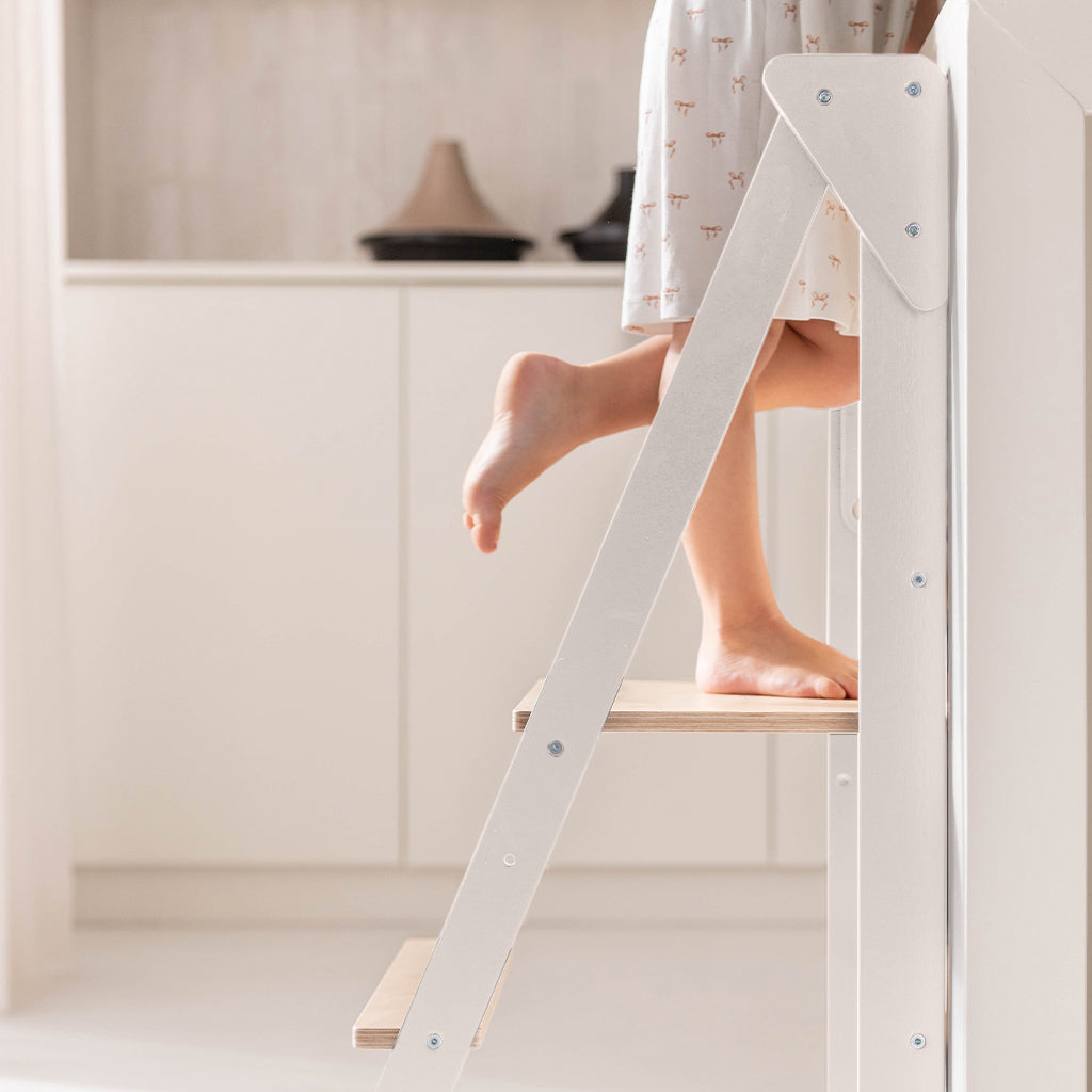 The learning tower can be used from the time your child is able to stand up independently until approximately 5 or 6 years old. It serves as a support for many everyday activities such as washing hands, cooking, peeling eggs, washing dishes, etc., and for creative games such as salt dough, modeling clay, cutting, etc.