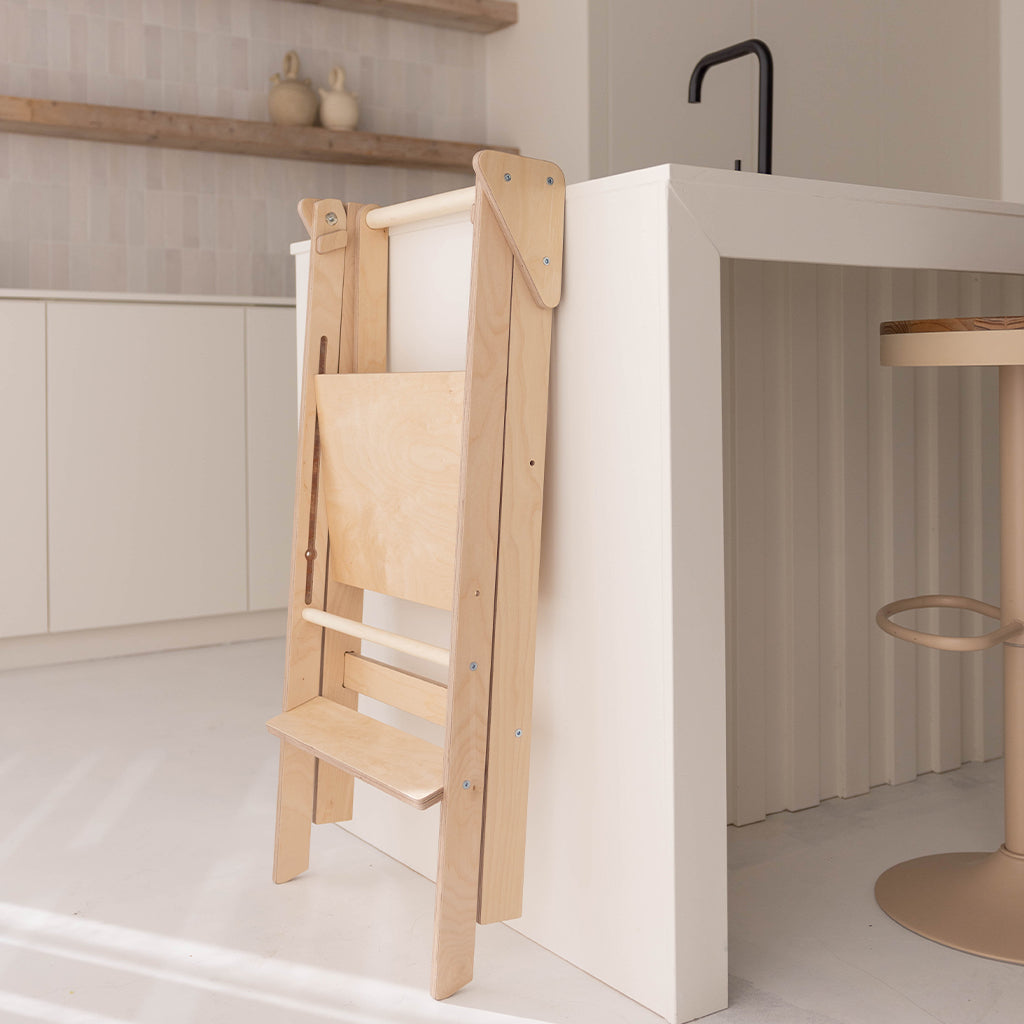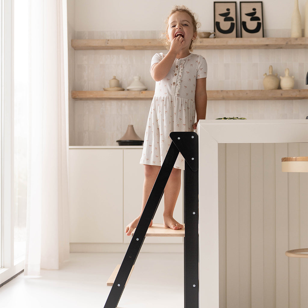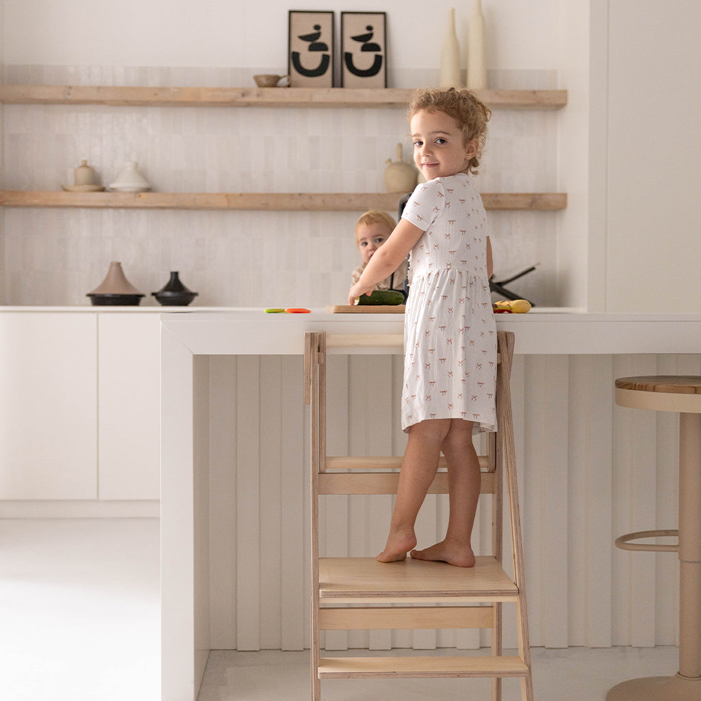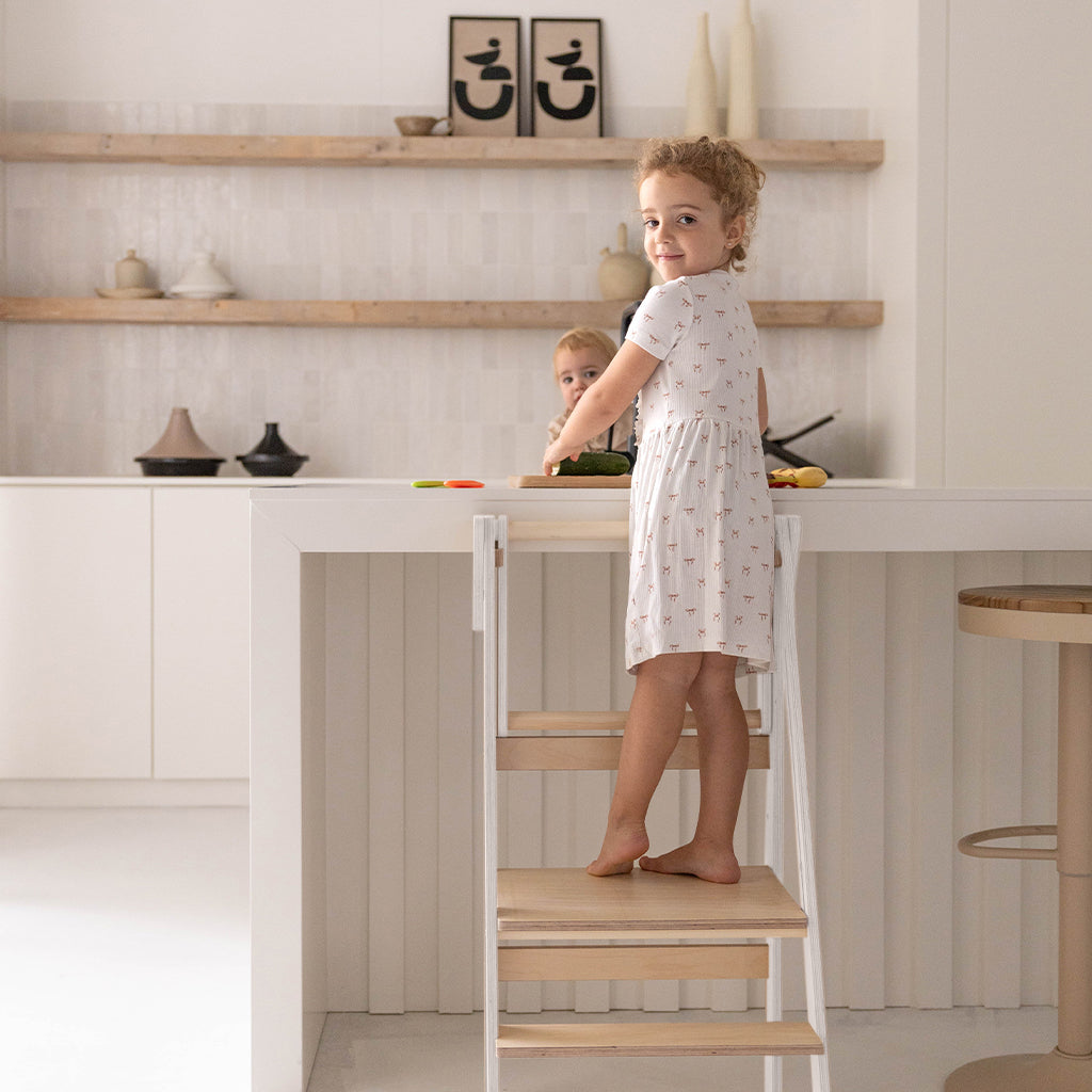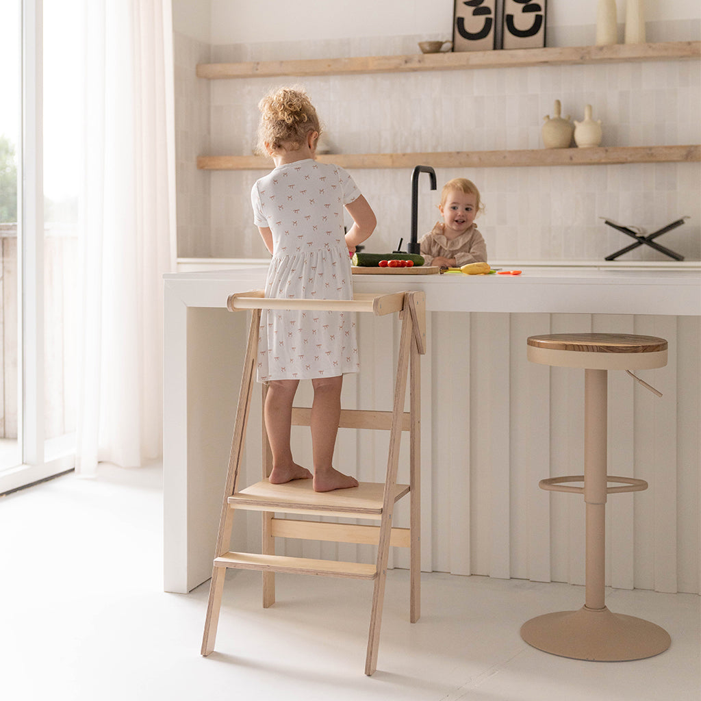 The learning tower can be used from the time your child is able to stand up independently until approximately 5 or 6 years old. It serves as a support for many everyday activities such as washing hands, cooking, peeling eggs, washing dishes, etc., and for creative games such as salt dough, modeling clay, cutting, etc.