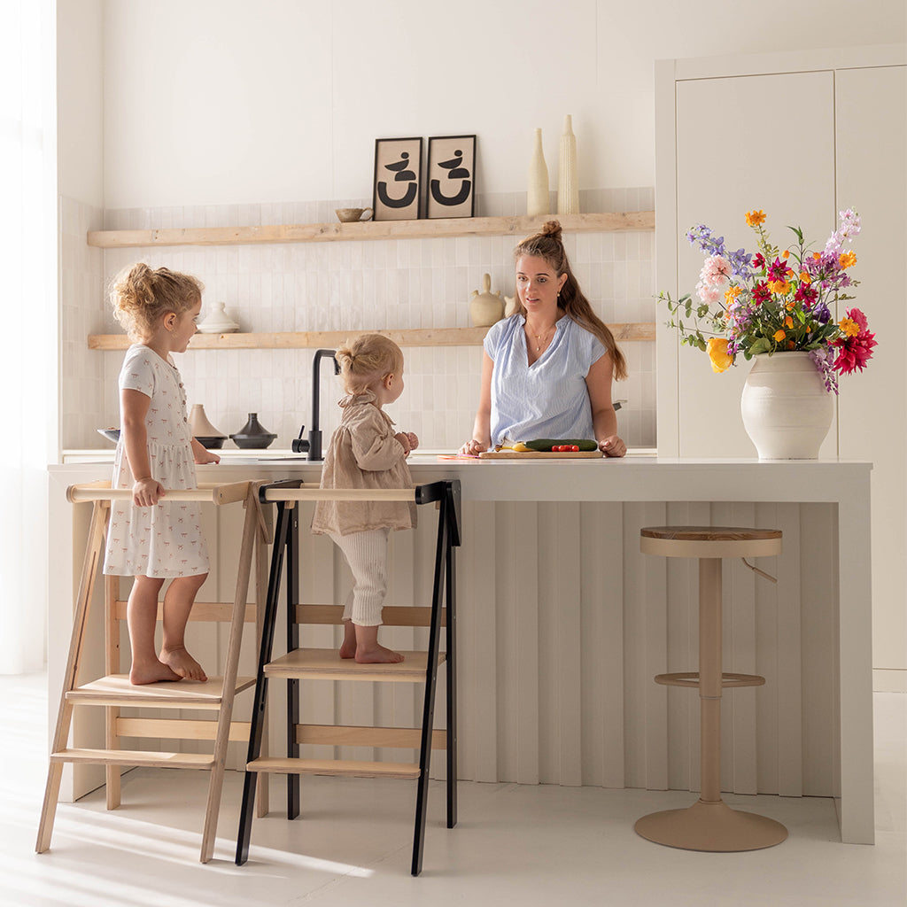 Our children observe and learn by participating in daily tasks and activities, while having the freedom to climb on and off their tower freely, and to do as we do - or as they do - with us independently.