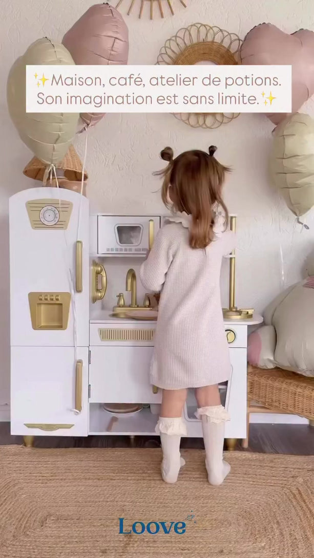 Descubra la elegancia atemporal de esta cocina clásica Blanco/Oro. Construcción de madera/MDF de alta calidad con detalles auténticos: puerta de horno abatible y botones giratorios con clics sonoros para una experiencia culinaria realista desde los 3 años.