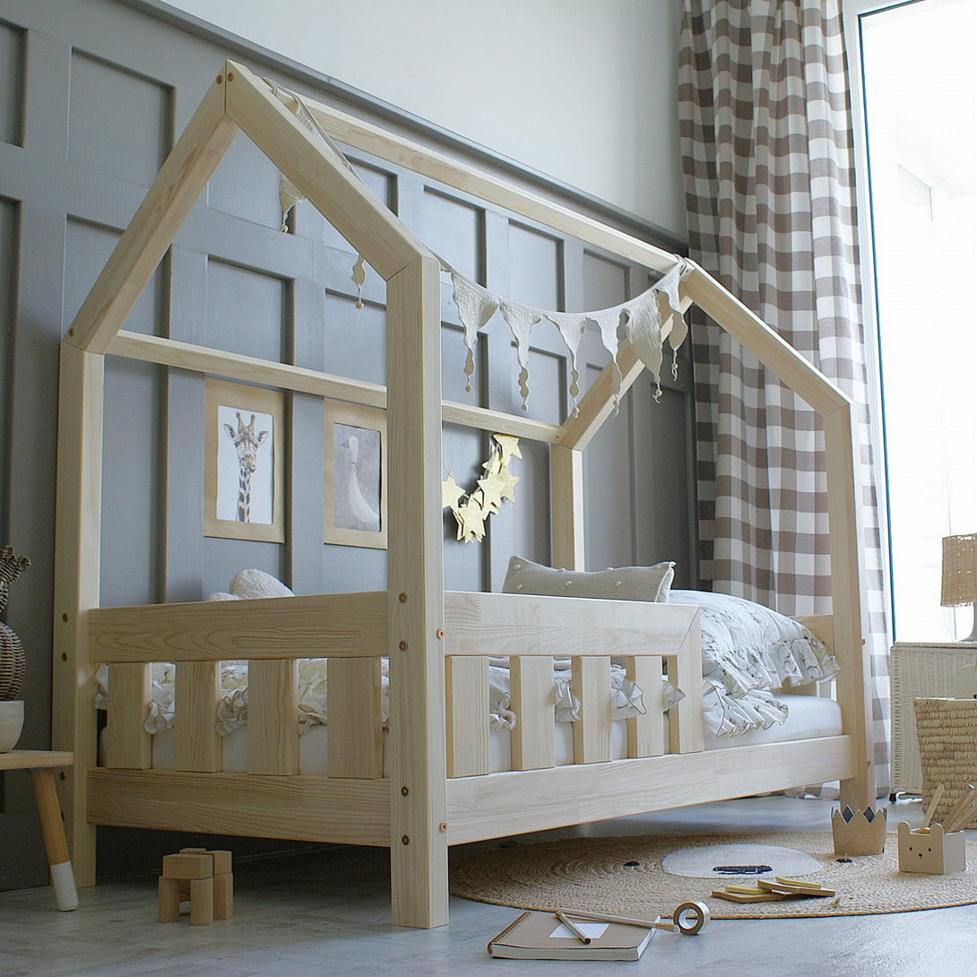 - Inclus : Structure complète avec sommier, montants verticaux, mini-toit, barrière frontale, visserie, chevilles en bois et colle à base d’eau pour fixation.