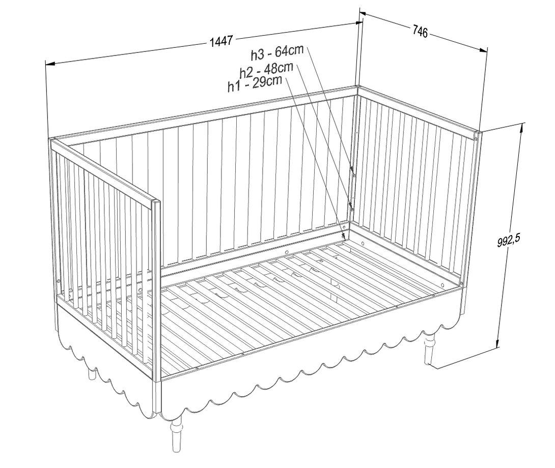 Con un altezza di 100 cm, una larghezza di 145 cm e una profondità di 75 cm, è pensato per integrarsi armoniosamente in tutti gli interni. È compatibile con un materasso 70 x 140 cm (altezza massima: 10 cm), creando un nido rassicurante per il sonno e il gioco.
