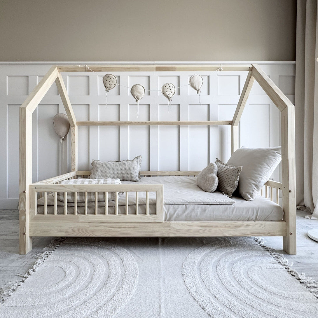 - Inclus : structure complète avec sommier, montants verticaux, mini-toit, barrières, visserie, chevilles en bois et colle à base d’eau pour fixation.