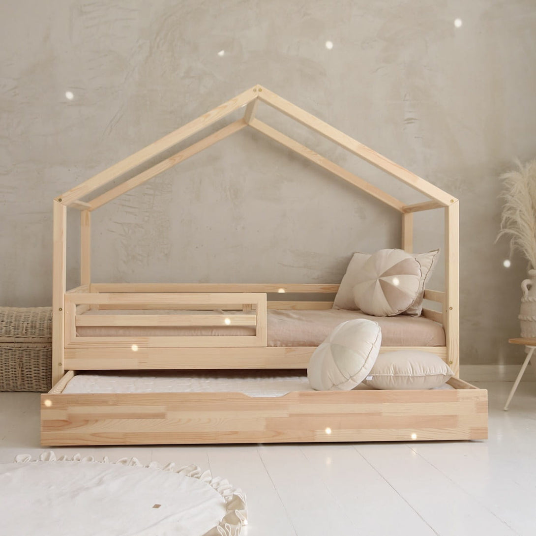 Il letto casetta Alma è un invito a sognare, giocare e crescere in tutta sicurezza. Con le sue sbarre di protezione e il tetto minimalista, crea un nido accogliente che rassicura i bambini e conquista i genitori.