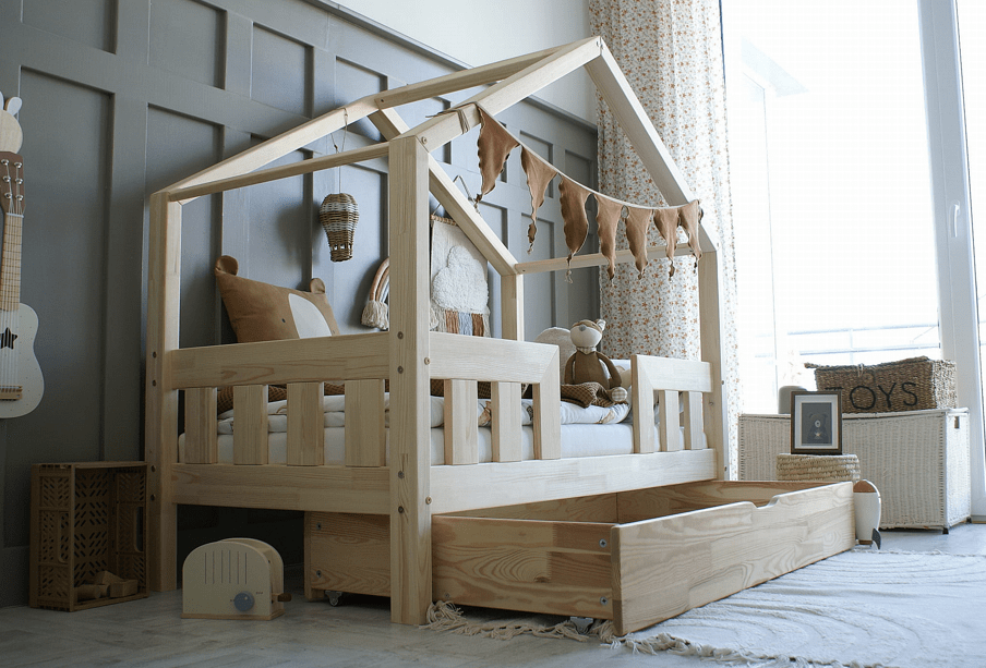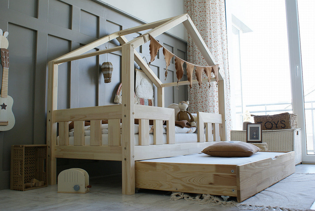 Il letto casetta Aya è un invito a sognare, giocare e crescere in tutta sicurezza. Con le sue sbarre di protezione e il suo tetto minimalista, crea un nido accogliente che rassicura i bambini e conquista i genitori.