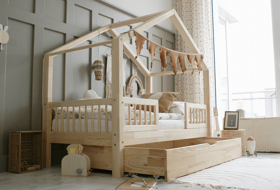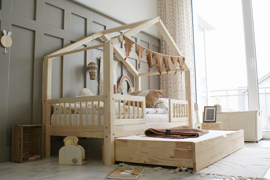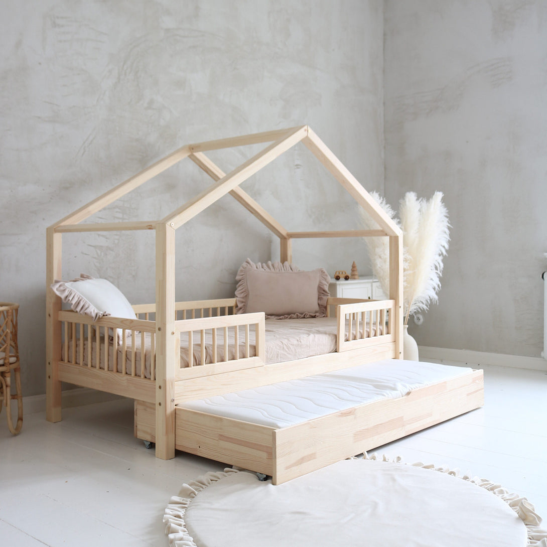 Il letto casetta Milie è un invito a sognare, giocare e crescere in tutta sicurezza. Con le sue sbarre di protezione e il tetto minimalista, crea un nido accogliente che rassicura i bambini e conquista i genitori.