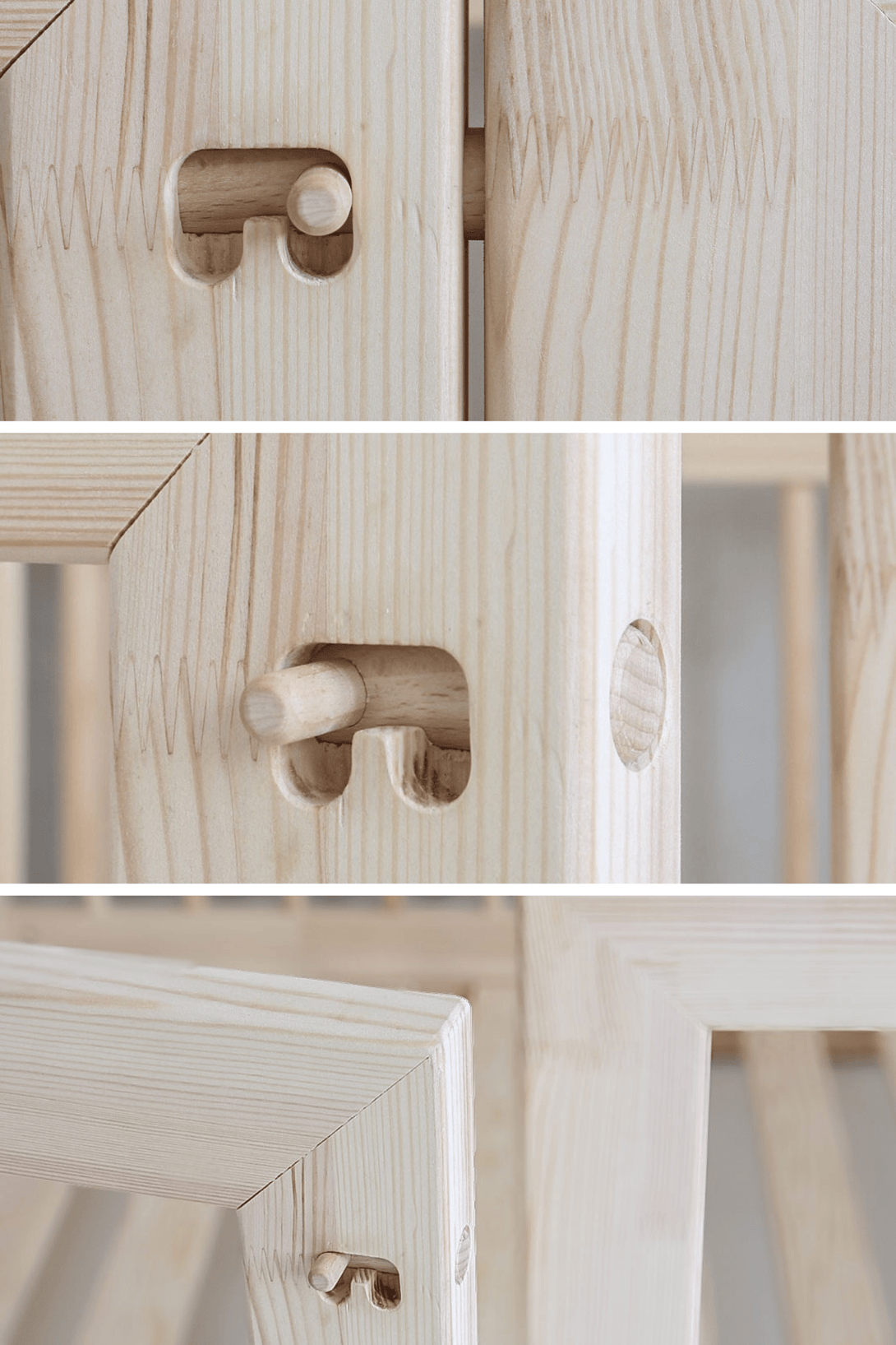 - Inclus : structure complète avec sommier, poutres verticales, barrières latérales, visserie, chevilles en bois et colle à base d'eau (pour les jonctions par chevilles en bois)