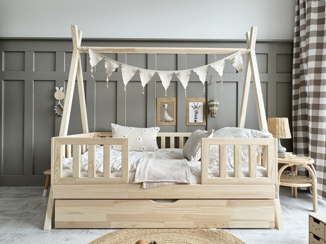 Il letto singolo tipi con cassetto Nohr trasforma la camera in un nido caldo e funzionale. Con la sua struttura a forma di tipi e le sue linee pulite, aggiunge un tocco giocoso e dolce all'universo del tuo bambino, incoraggiando al contempo la sua autonomia.