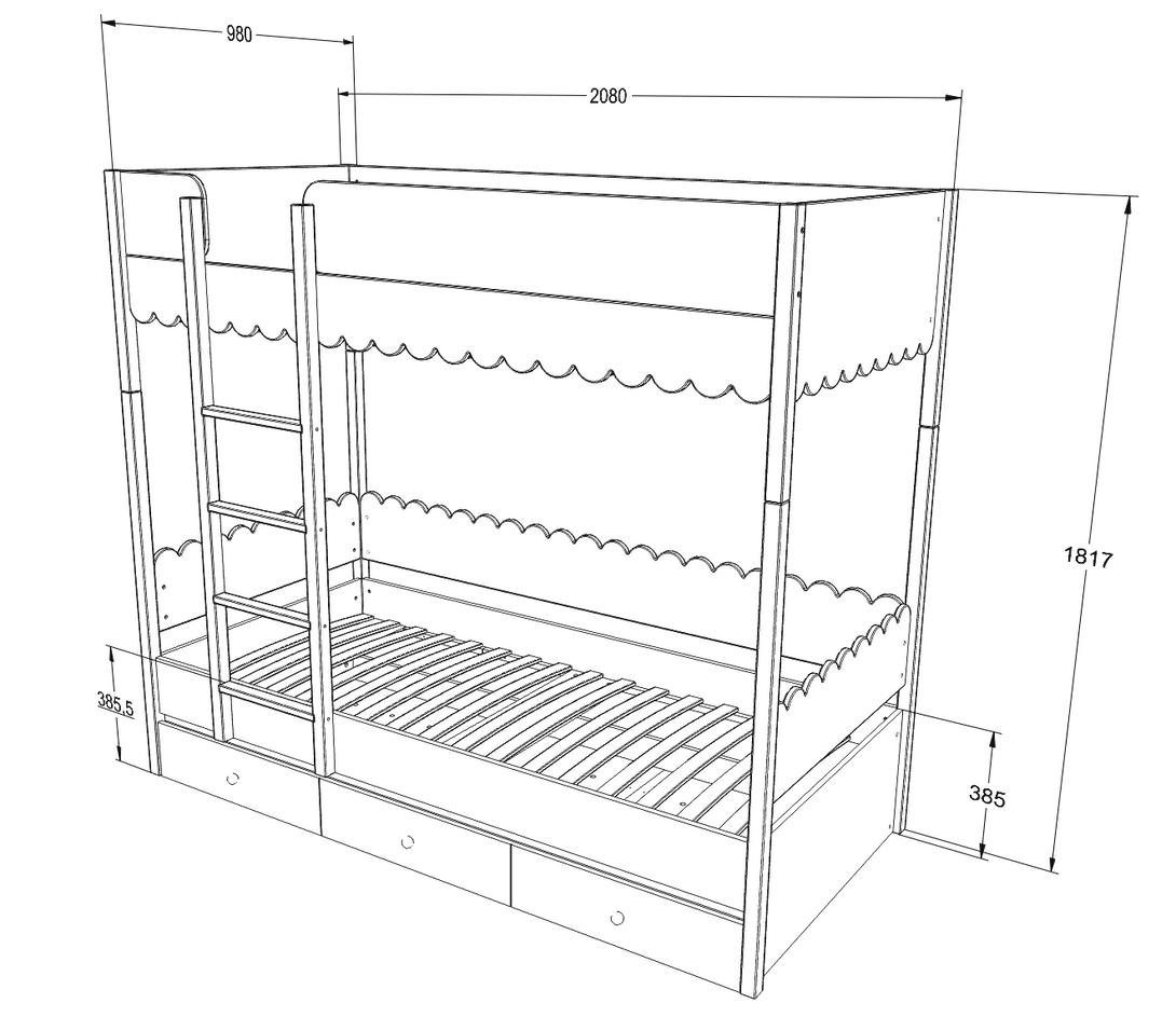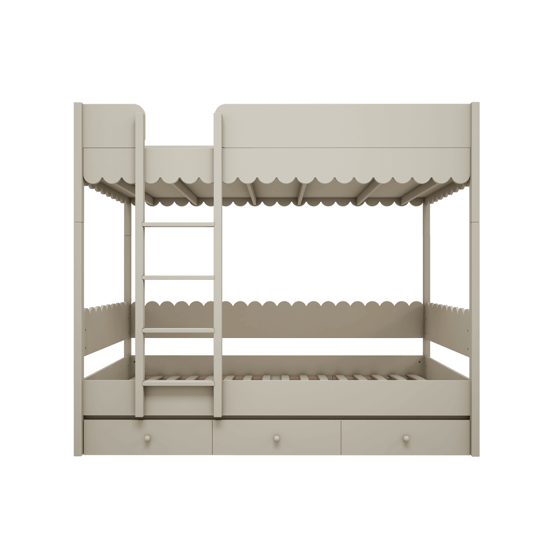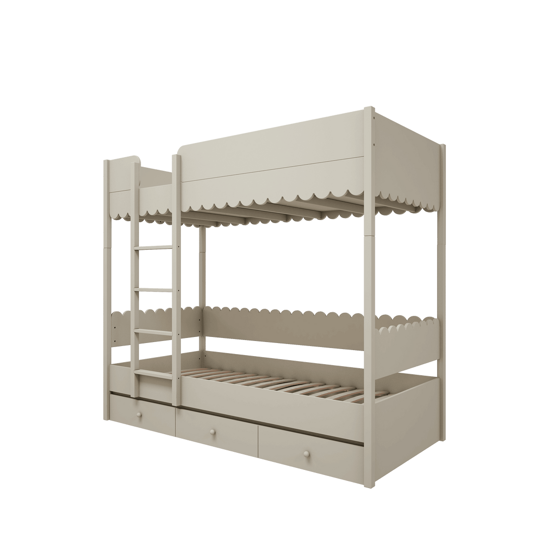 Create un universo fiabesco con il letto a castello Babushka. Design unico con dettagli artigianali smerlati che creano un'atmosfera nostalgica e calda. Letto superiore sicuro dai 6 anni, letto inferiore confortevole, cassetto trasformabile in un terzo letto per le serate pigiama.