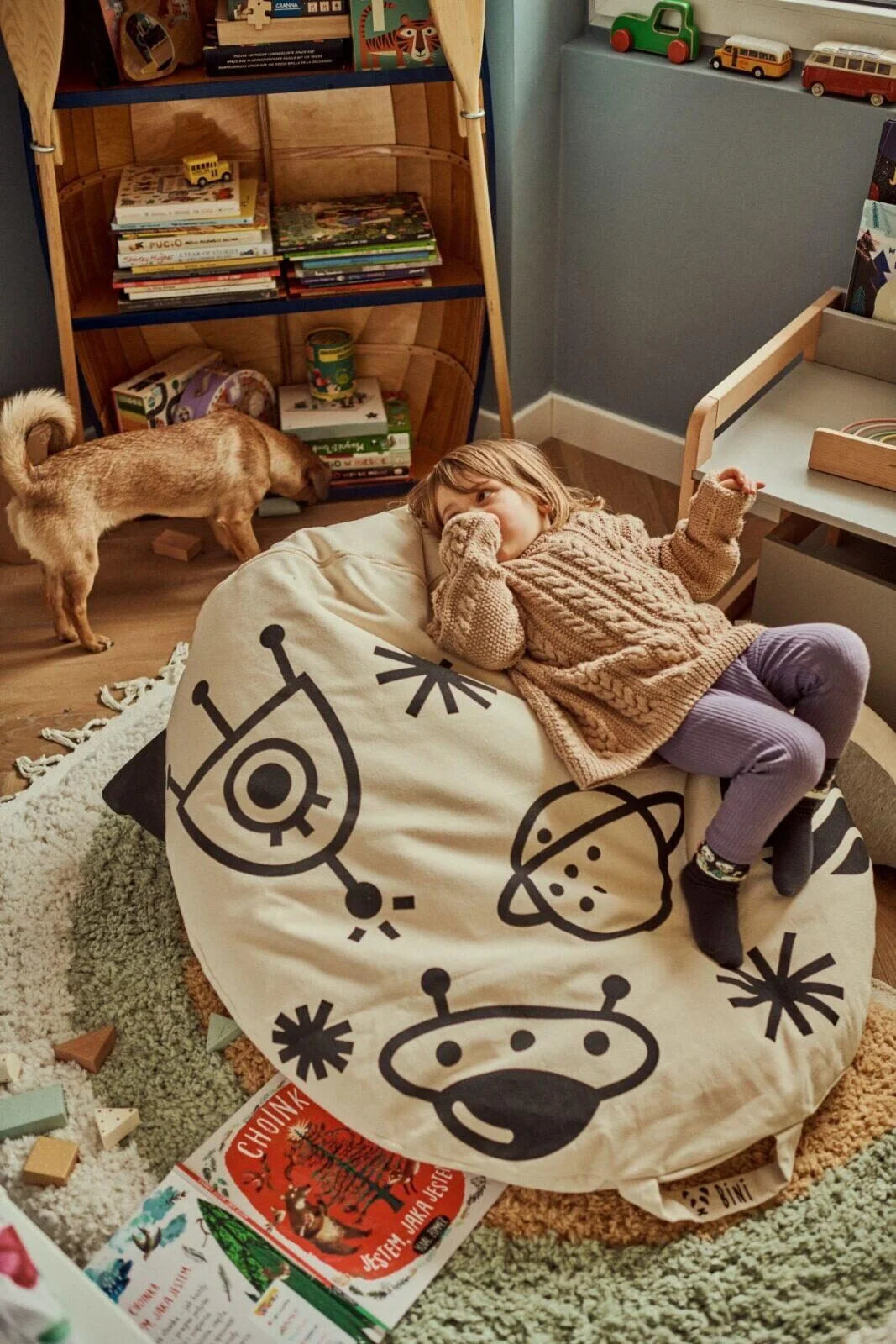 La poltrona sacco Bini è adatta ai bambini abbastanza grandi da potersi muovere da soli. Può supportare molte attività di concentrazione e gioco libero per molti anni ed è adatto anche per gli adulti!