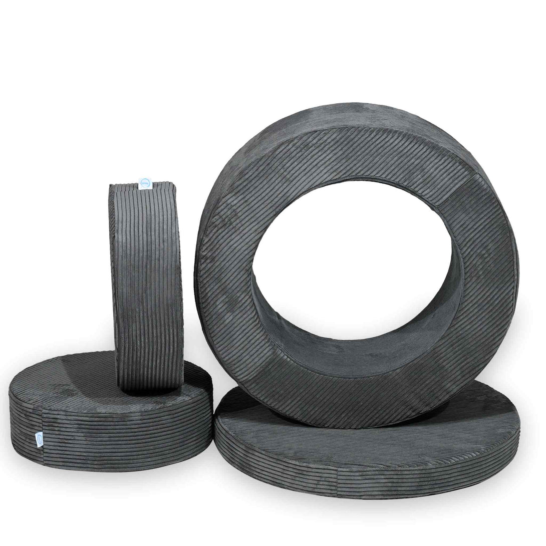 Trasforma il gioco libero in un'avventura creativa con questo pouf modulare a 4 elementi. Due piccoli cerchi, un anello spesso con apertura e un grande cerchio sottile si combinano all'infinito per creare tunnel, barriere, tavoli, sedute o piscina di palline. Il tuo bambino inventa, costruisce e trasforma il suo spazio di gioco secondo la sua immaginazione e le sue esigenze motorie del momento.