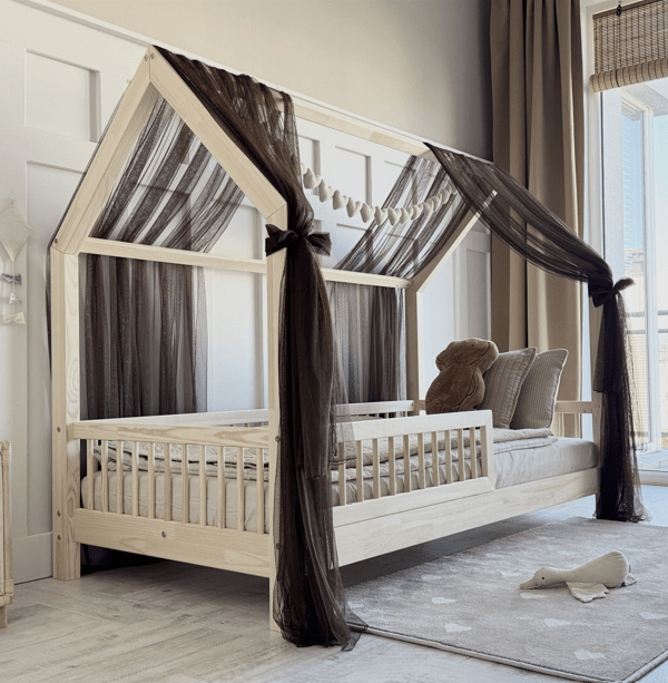 Trasforma il letto casetta di tuo figlio in un nido fiabesco con il velo Halona, progettato appositamente per i letti con tetto orizzontale. In tulle leggero, crea un'atmosfera calda, ideale per il riposo, la lettura o il gioco in tutta tranquillità.