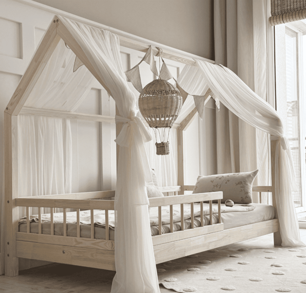 Trasforma il letto casetta di tuo figlio in un nido fiabesco con il velo Halona, progettato appositamente per i letti con tetto orizzontale. In tulle leggero, crea un'atmosfera calda, ideale per il riposo, la lettura o il gioco in tutta tranquillità.
