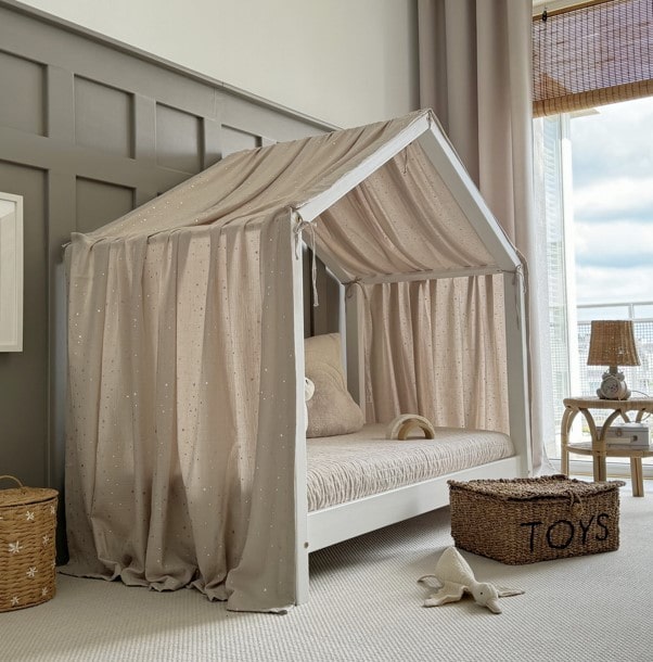 Trasforma il letto casetta del tuo bambino in un nido fiabesco con il velo Laramie, progettato appositamente per i letti a forma di A. In mussola di cotone morbida e leggera, crea un'atmosfera calda, ideale per il riposo, la lettura o il gioco in tutta tranquillità.