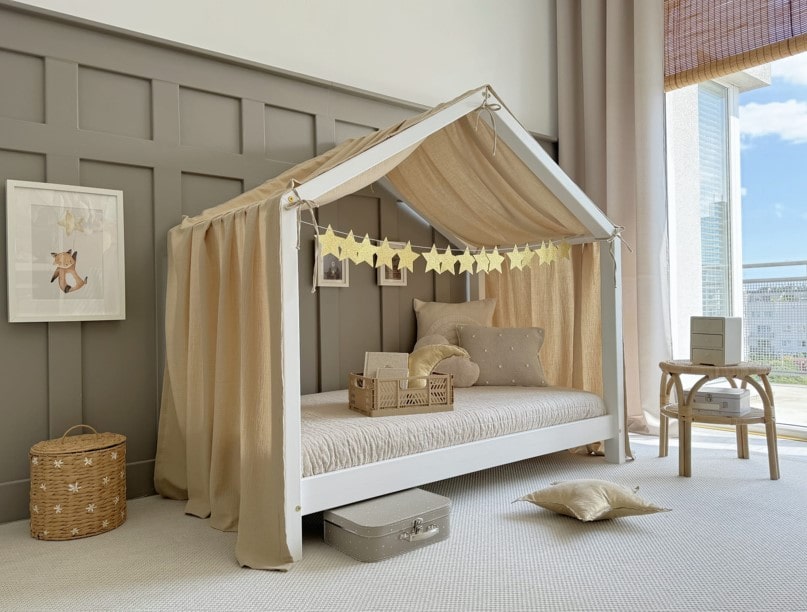 Facile da installare sulla struttura del letto casetta, avvolge lo spazio di dolcezza e stimola l'immaginazione. Il tuo bambino vi troverà un rifugio rassicurante per addormentarsi serenamente o inventare mille storie al riparo dal mondo. Un accessorio decorativo tanto pratico quanto poetico, pensato per le camere dei bambini ispirate alle pedagogie attive.
