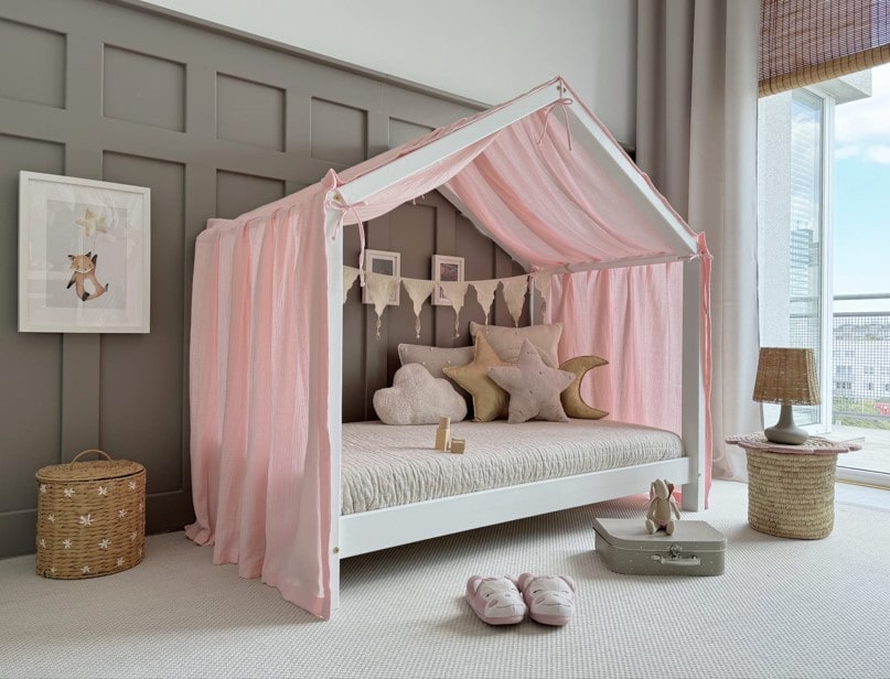 Trasforma il letto casetta del tuo bambino in un nido fiabesco con il velo Laramie, progettato appositamente per i letti a forma di A. In mussola di cotone morbida e leggera, crea un'atmosfera calda, ideale per il riposo, la lettura o il gioco in tutta tranquillità.