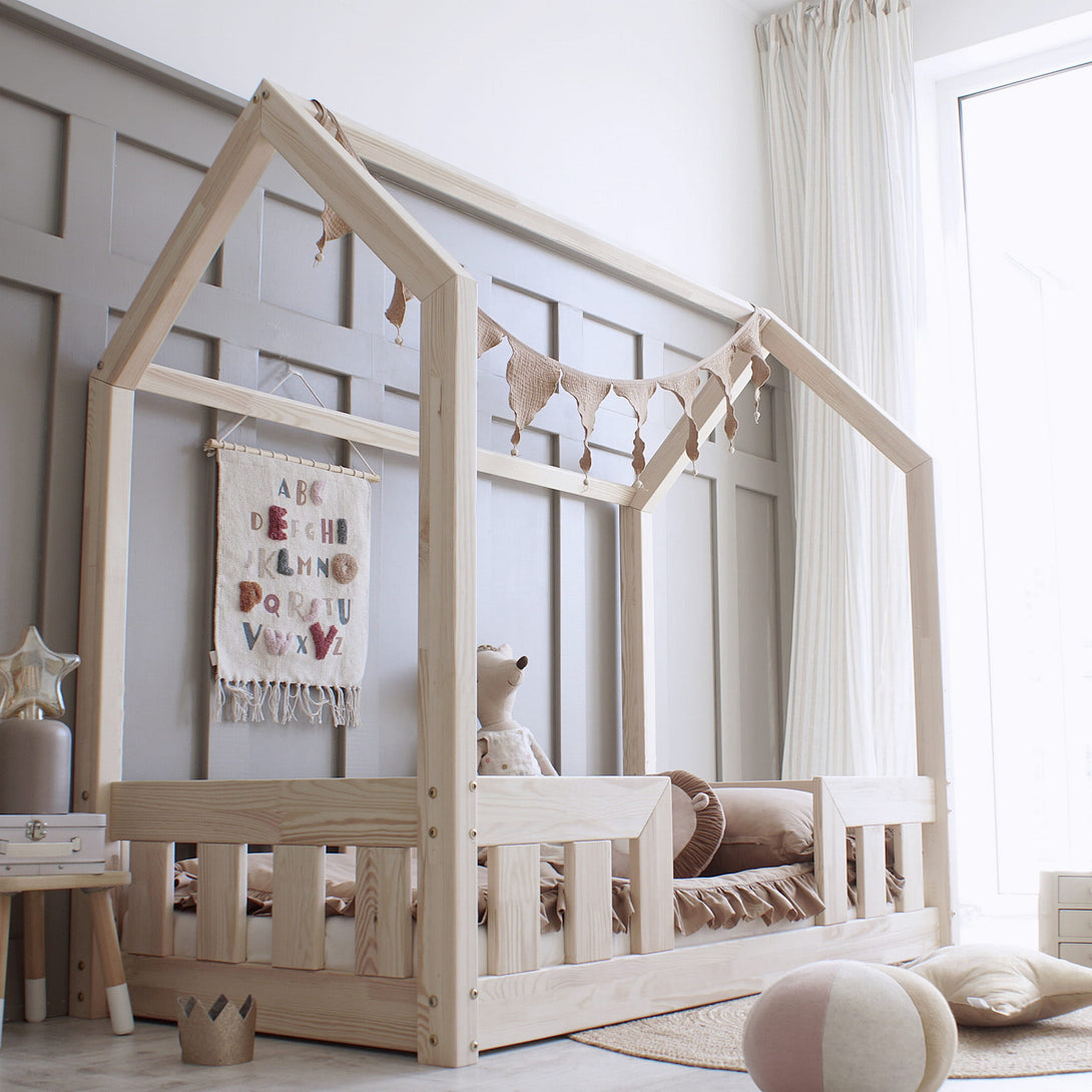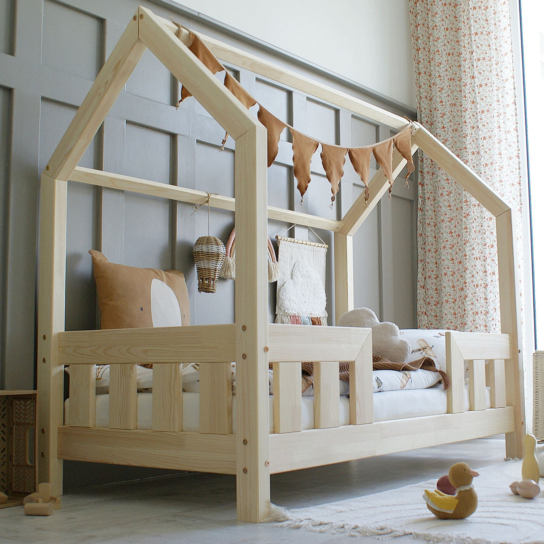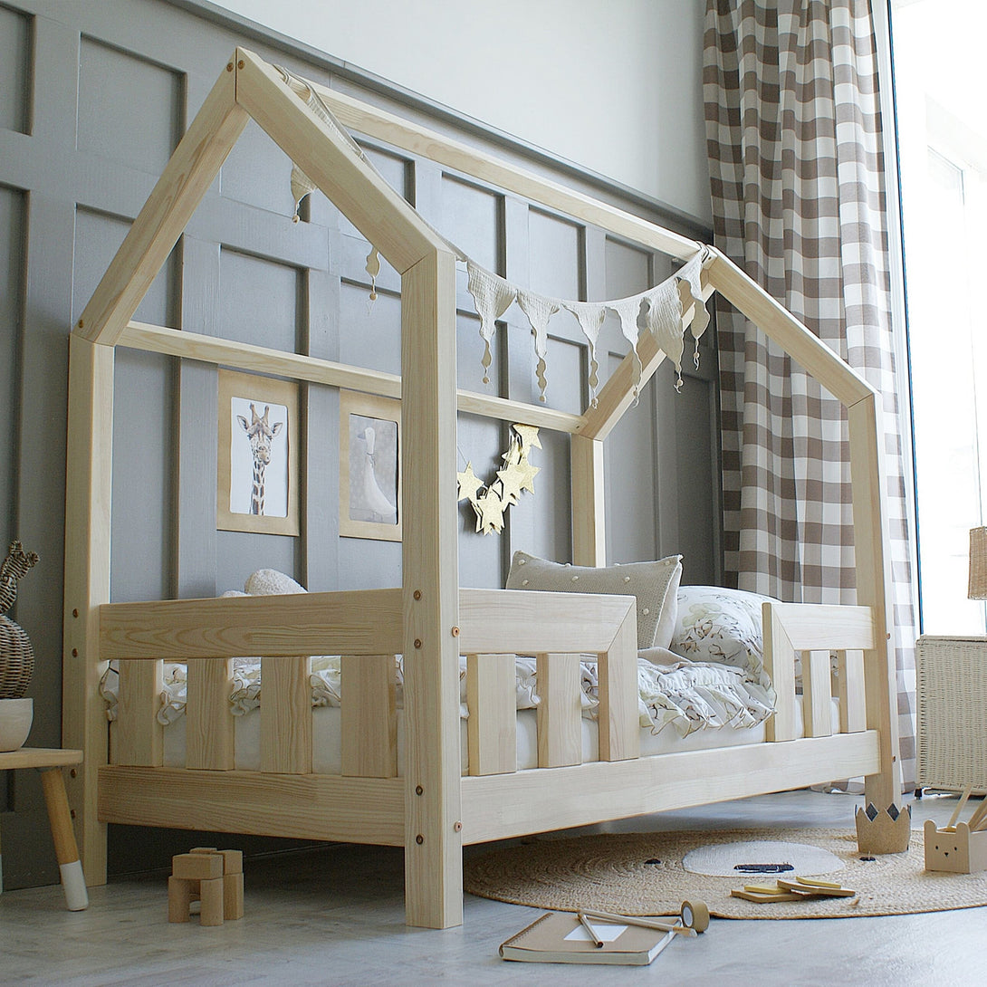 - Inclus : Structure complète avec sommier, montants verticaux, mini-toit, barrières latérales et frontales, visserie, chevilles en bois et colle à base d’eau pour fixation.
