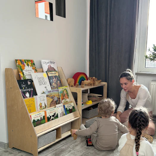Avec ses 4 niveaux d’exposition inclinés et ses 2 compartiments de rangement inférieurs, elle allie visibilité, praticité et grande capacité. Les livres restent bien en place et toujours accessibles, incitant à la lecture spontanée et à l’exploration du monde par les histoires.
