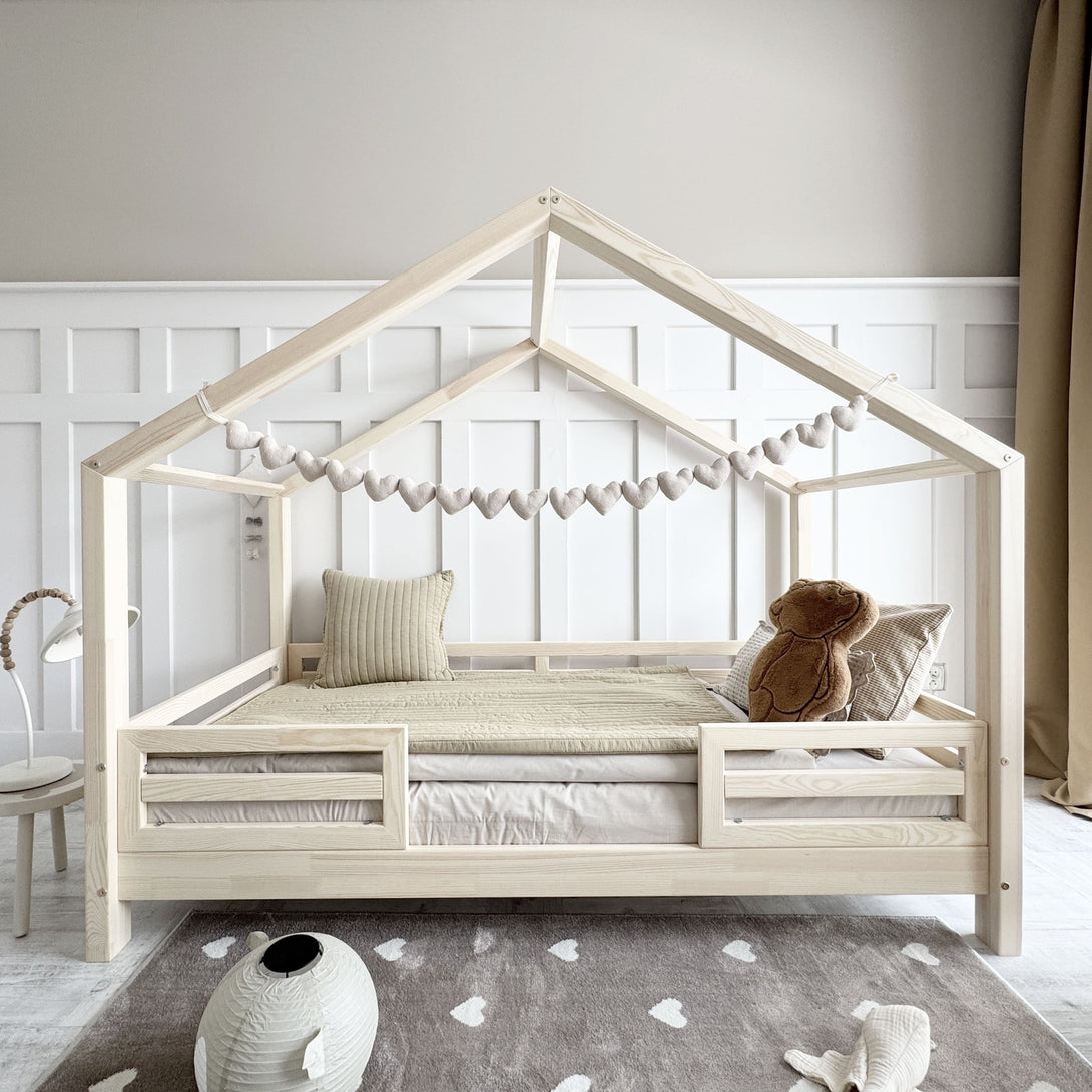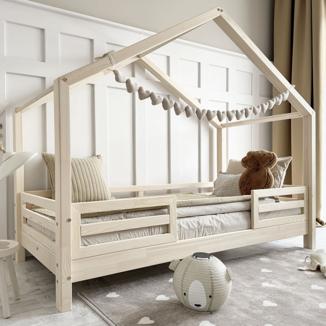 - Inclus : structure complète avec sommier, montants verticaux, mini-toit, rambardes latérales, deux barrières frontales amovibles, visserie, chevilles en bois et colle à base d’eau.