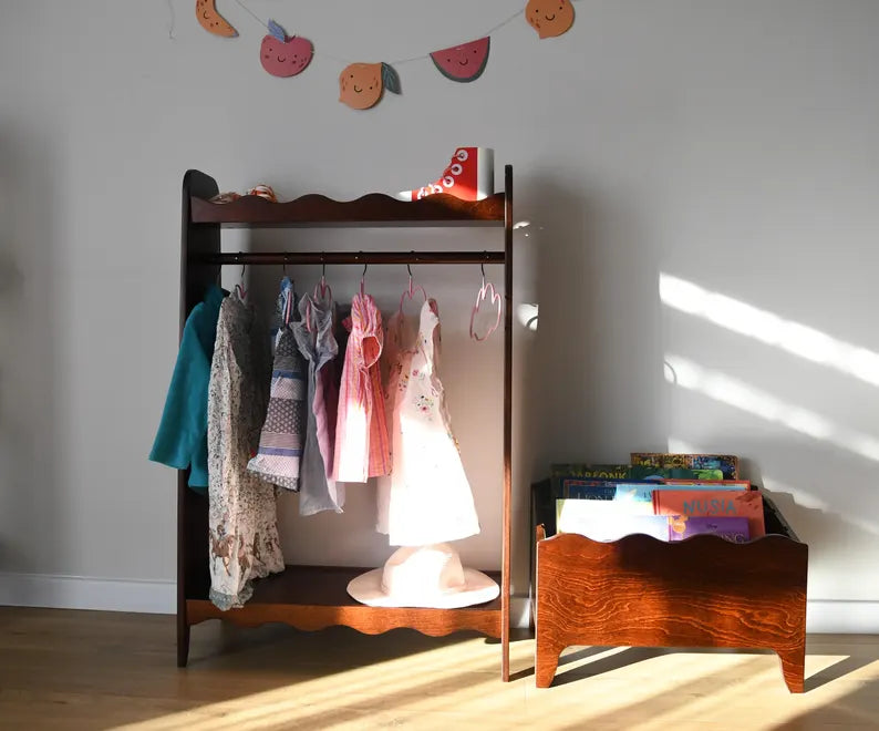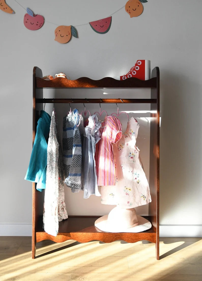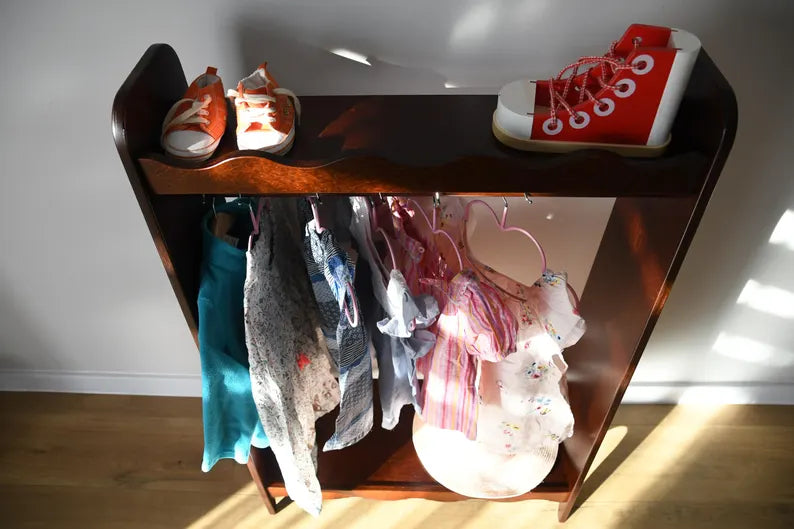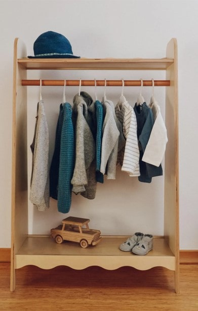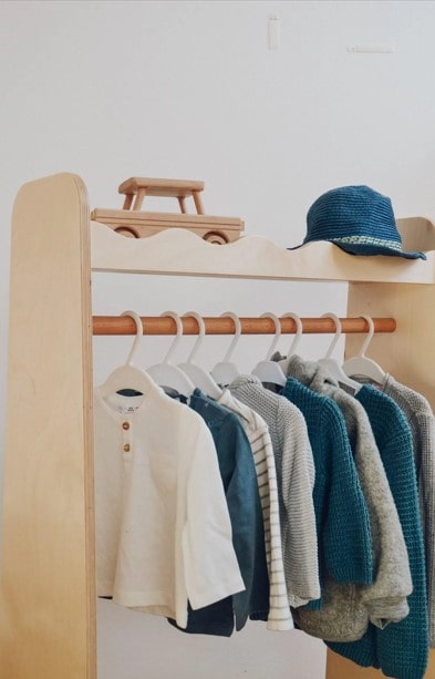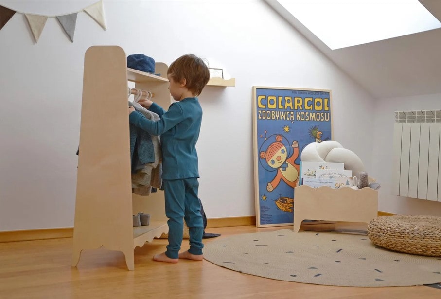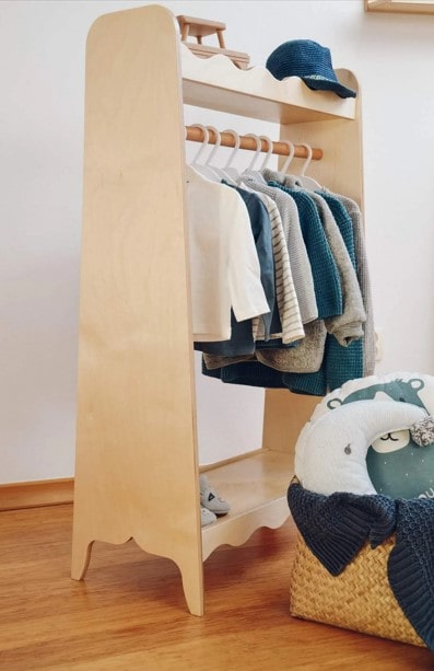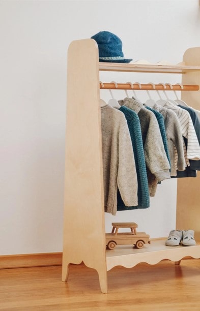 Développez l'autonomie vestimentaire avec ce porte-vêtements Montessori Dune à hauteur d'enfant. Design festonné en contreplaqué bouleau FSC permettant aux tout-petits d'accéder facilement à leurs vêtements et de cultiver leur indépendance dès 18 mois.