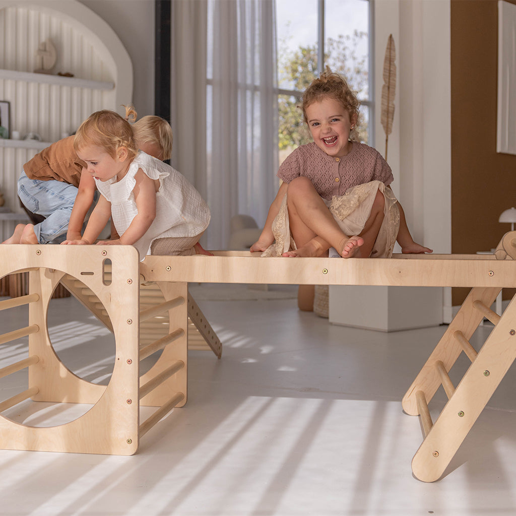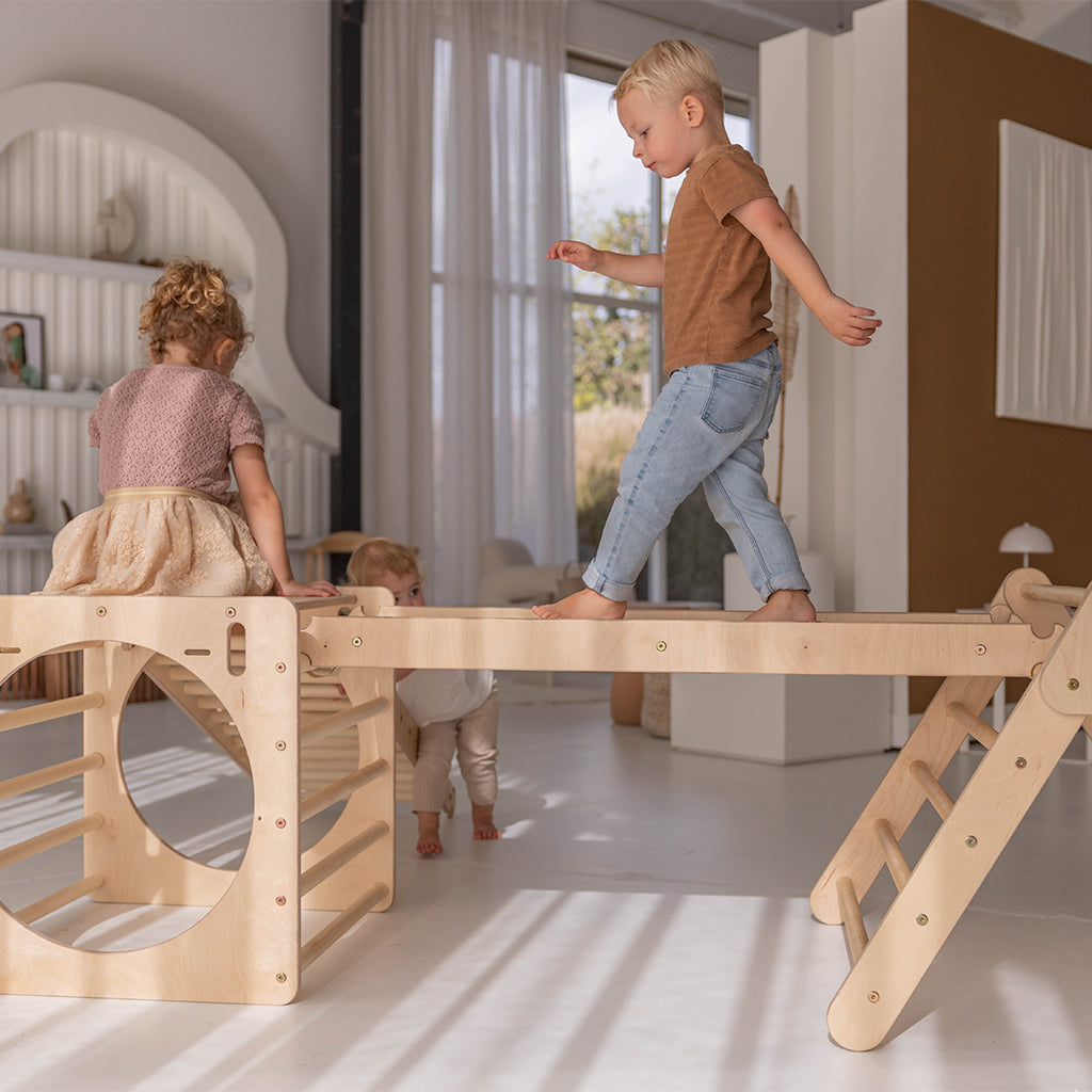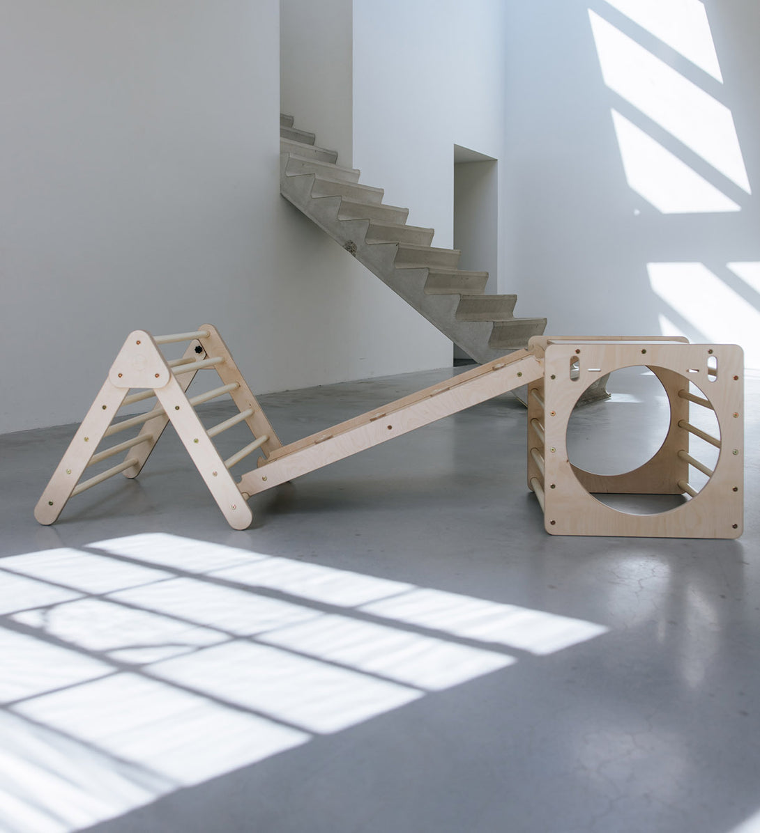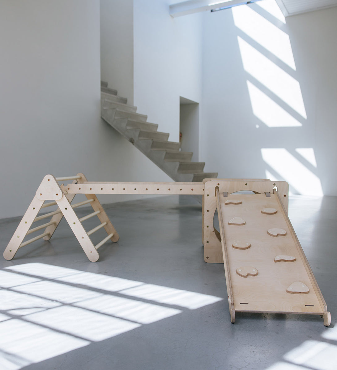 Même lorsqu’ils sont encore tout petits, le triangle peut déjà l’utiliser pour y suspendre leurs mobiles. Grâce à ses positions réglables, il s’ajuste aux capacités et aux envies des enfants pour leur proposer des pentes plus ou moins douces.