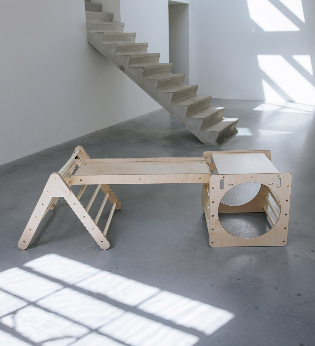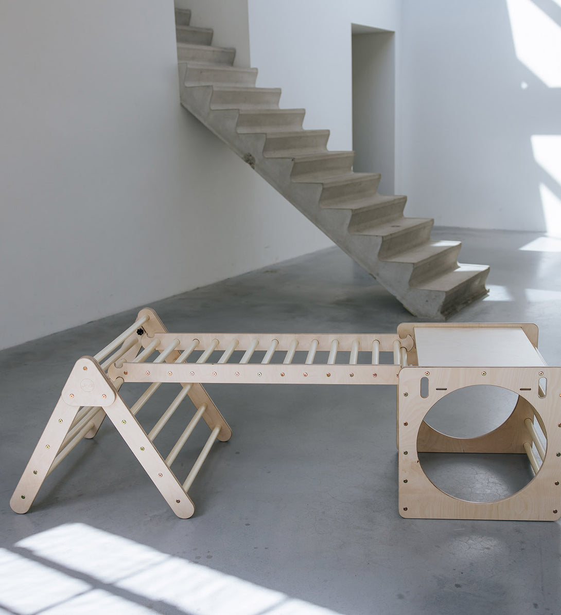 Le cube de Pikler donne aux enfants un support de motricité libre unique. Ils vont escalader, descendre, utiliser leurs bras, leurs jambes, mais aussi leurs mains et leurs pieds, et c’est en fait leur corps tout entier qu’ils vont activer pour coordonner leurs gestes.