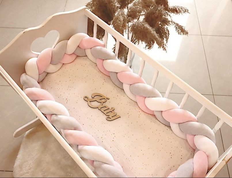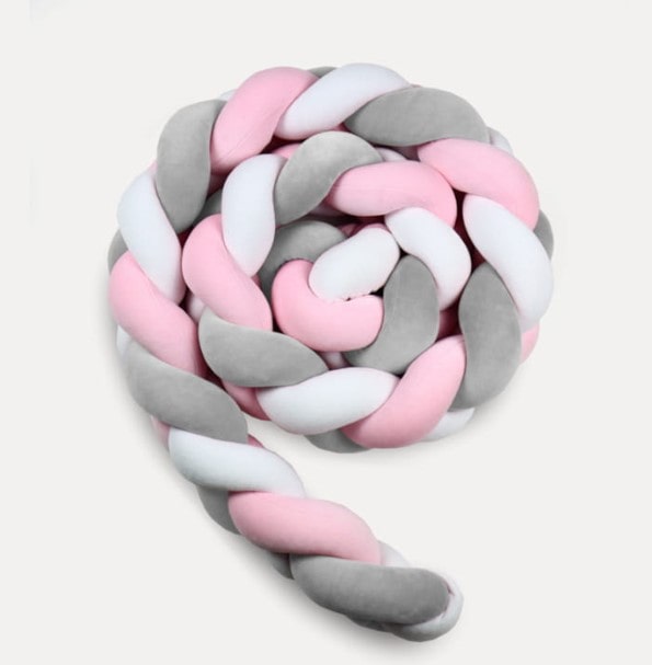 Tour de lit tressé 3 épis en velours Rose, Blanc et Gris | 9 Tailles